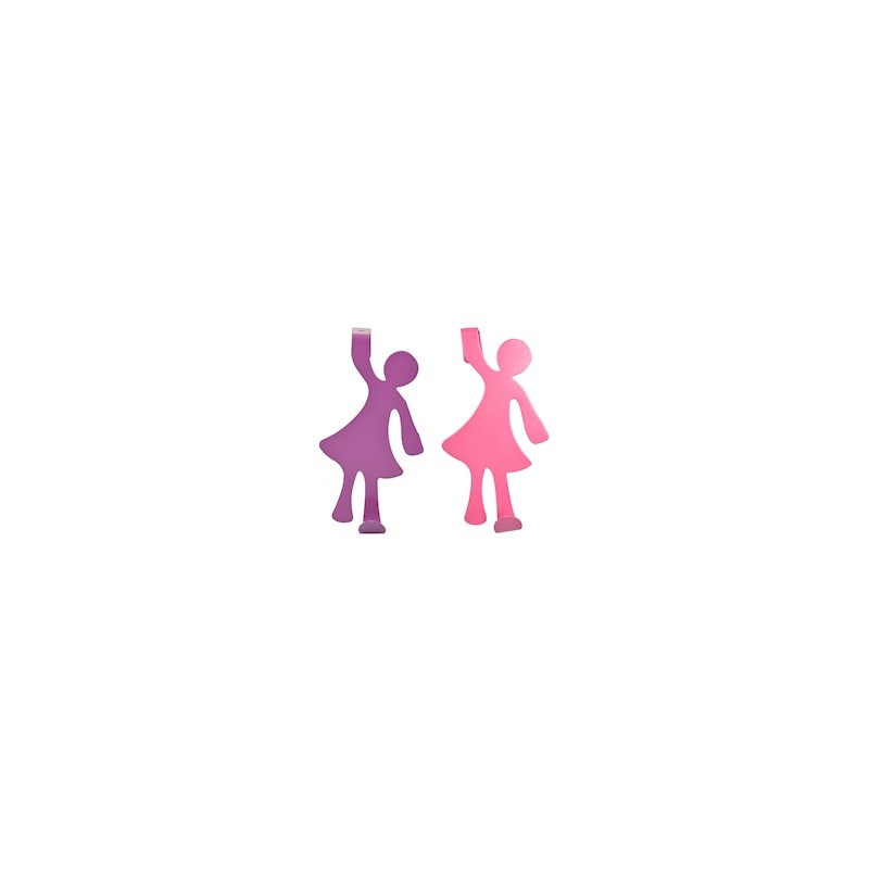 Perchero individual Trendy Loft, brinda un sitio en donde organizar o colgar batas, accesorios, bolsos, y demás artículos ligeros dentro de las habitaciones. Cuenta con un atractivo diseño con figura de niña que puede colocarse en los marcos de las puertas con un grosor máximo de 4 cm, sin la necesidad de utilizar herramientas y tornillos. Elaborado en metal resistente y sus dimensiones son 15 x 8 x 5 cm. El perchero está disponible en color morado y rosa.