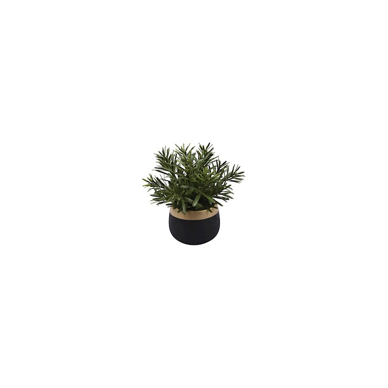 Planta artificial en color verde mate, cuenta con 23.1 cm de altura y una maceta de cerámica negra con una cenefa dorada en la orilla, por ser sintética permite ahorrar agua y estar totalmente libre de pesticidas. Brinda un fácil y rápido montaje a mano, no requiere mantenimiento después de su instalación, se puede usar para simular naturaleza o bien, para dar estilo al patio, baño o a las habitaciones de cualquier sitio. Está fabricada para ofrecer personalidad en interiores o exteriores, durabilidad y alta calidad por mucho más tiempo de lo esperado.