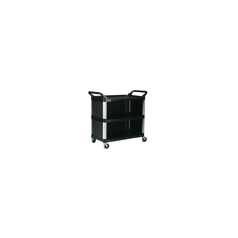 El carro de servicio con tres páneles laterales de Rubbermaid Commercial Products es atractivo para múltiples aplicaciones. Es ligero y fácil de manejar gracias a sus ruedas silenciosas que no dejan marcas.