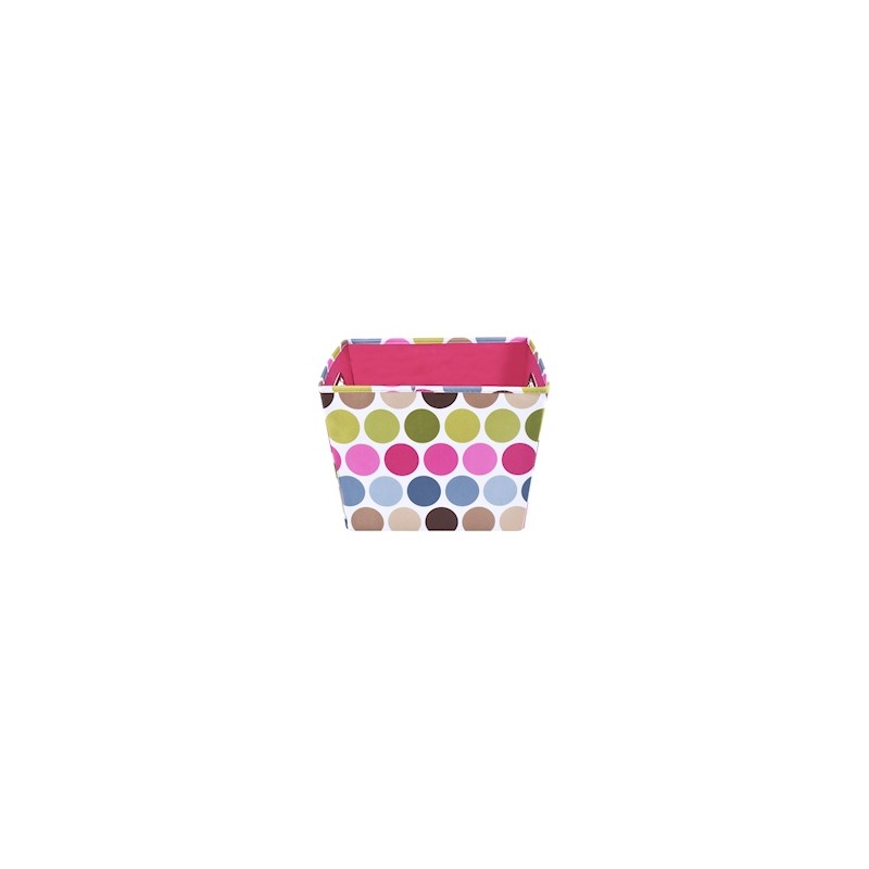 Gaveta grande Home & Home, almacena y organiza artículos personales u objetos del hogar. En sus lados laterales tiene agarraderas metálicas para poder transportarla con sencillez. Está elaborada con 100% poliéster y soporte de cartón que la hacen una pieza ligera y no permiten que se deforme. Tiene las dimensiones 27 x 35 x 27 cm. Su diseño con círculos en colores café, beige, azul, verde y rosa sobre fondo blanco, con interior color rosa, que la convierten en un complemento decorativo.