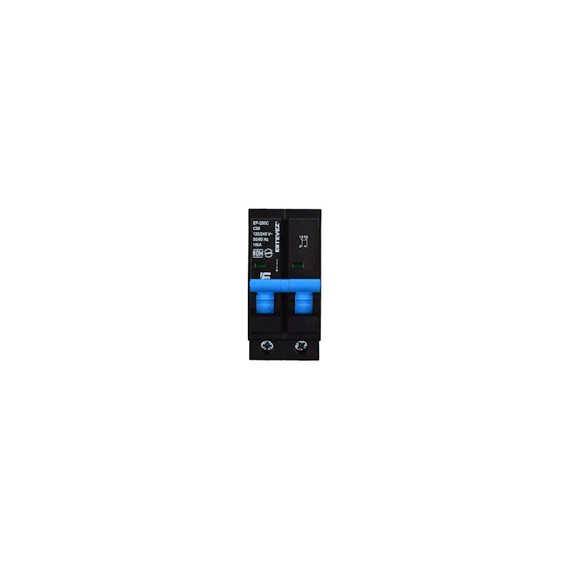 Interruptor termomagnético Estévez tipo plug, curva C, con capacidad de 2 polos, trabaja con corrientes eléctricas de 50 amperes y tensión de 120/240 volts. Cuenta con cámara de arqueo que ayuda a disipar las descargas eléctricas evitando daños a las instalaciones. Soporta e interrumpe corrientes en condiciones anormales, como sobrecargas y cortos circuitos, además cuenta con función aislante. Está fabricado en plástico, apto para interiores. Tiene un indicador de posición de contacto, su capacidad interruptiva es de 10 kiloamperes y sus dimensiones son 3.7 x 7 x 8 cm.