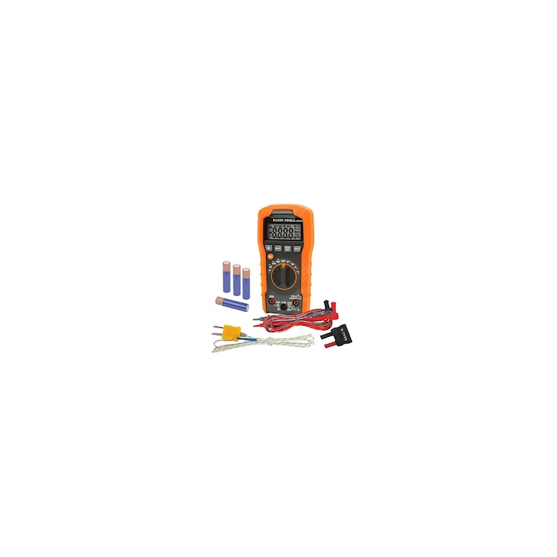 Multímetro digital de rango automático Klein Tools de 600 voltios. Tiene la función de medir voltaje CA/CD, corriente CA/CD y resistencia. También sirve para medir temperatura, capacitancia, frecuencia, ciclo de servicio y para probar diodos y continuidad. Mide voltaje de hasta 600 V CA/CD, corriente de hasta 10 A CA/CD y tiene resistencia de hasta 40 M937. La clasificación de seguridad es CAT III, además, está elaborado para resistir una caída desde 3,3 (1 m) de altura y para soportar el uso y desgaste diarios en el lugar de trabajo. Cuenta con indicador de batería baja y compartimento de baterías de fácil acceso. Incluye cables de prueba, termopar con adaptador y baterías.