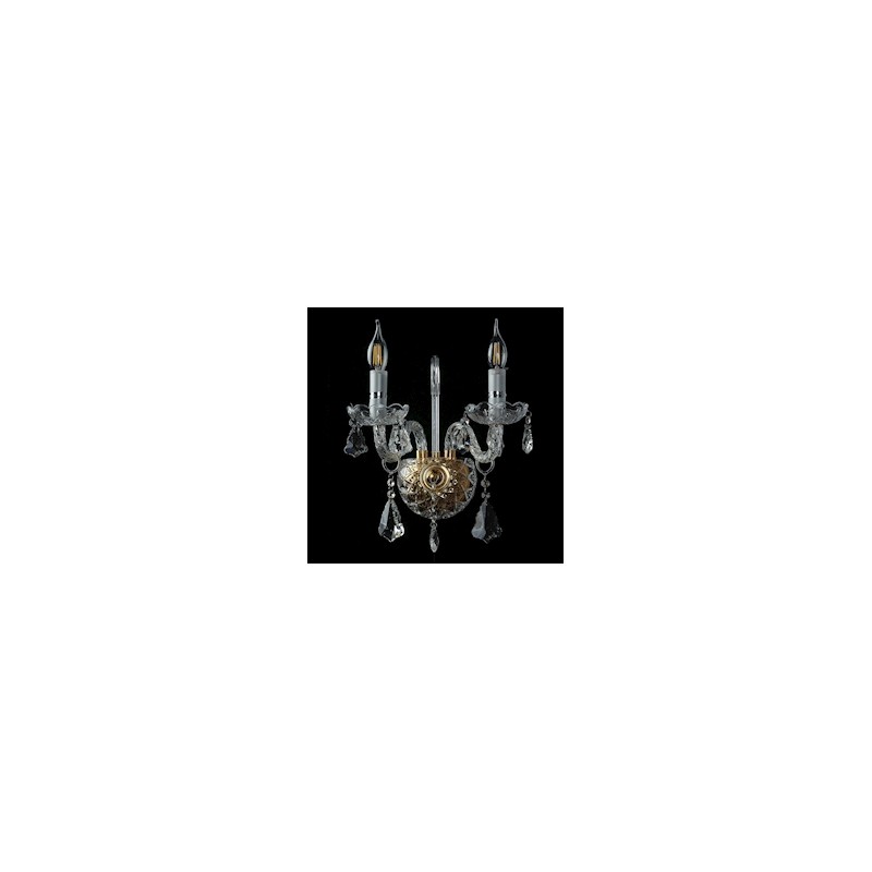 Arbotante de pared palace Gamalux, apto para espacios interiores como salas, pasillos o habitaciones. Está elaborado de metal dorado y cristal cortado brillante, su diseño con 2 velas brinda un toque clásico y elegante a la decoración. Sus dimensiones son 23 x 30 cm y un peso de 3 kg. Trabaja con 2 sockets E12 para focos LED (no incluidos).