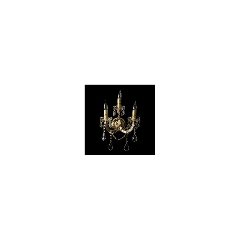 Arbotante Ma Theresa de pared Gamalux, apto para espacios interiores como salas, pasillos o habitaciones. Está elaborado de metal dorado y cristal cortado brillante, su diseño con 3 velas brinda un toque clásico y elegante a la decoración. Sus dimensiones son 25 x 30 cm y un peso de 3 kg. Trabaja con 3 sockets E12 para focos LED (no incluidos).